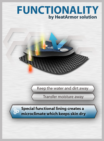 Bright colours and light weight make Eleor superior also in warm working conditions. The skin moisture is transferred from user's shoulders to the upper layers. Functionalities of HeatArmor lining are at best with technical shirt.